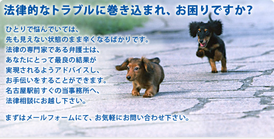 ◇ 相続、遺言作成、相続放棄、離婚、刑事事件等の法律相談 :30分間5,500円(税込) ◇ 会社経営上の法律相談(顧問弁護士、契約書、労使関係等)の法律相談 :30分間5,500円(税込) ◇ 交通事故の法律相談は無料です。 ◇ 不倫慰謝料に関する法律相談は、30分無料です。 30分経過後から、30分ごと5,500円(税込)有料相談となります。 ◇ 債務整理、自己破産、過払い金回収、任意整理・個人再生については、 無料法律相談を行っています。 ※当法律事務所の法律相談は、完全予約制となっております。 ◇清水綜合法律事務所 ◇ 〒450-0002 愛知県名古屋市中村区名駅三丁目26番19号 名駅永田ビル5階 ◇ TEL : 052-587-3555 ◇ 業務時間:平日9:30〜18:30 ◇名古屋駅(桜通口)を出てすぐ、大名古屋ビルの東側にある弁護士事務所です。 東海地域全域にお住まいの皆様方にとって、地理的にも心理的にも アクセスしやすい法律の専門家でありたいと思っています。 企業・個人のいずれにも、法的な選択を迫られる局面が存在します。 こういった時、向き合うべき問題から目を背けてしまうことは、あなたにとって 良い結果を生まないことでしょう。 事態が進行して解決が難しくなってしまわないように、”予防と早期の治療”が肝要です。 どうしたらよいのか分からない…と途方に暮れてしまう前に、相談してください。 個人様の法律相談はもちろんのこと、会社経営上生じる契約関係や従業員関係に関する お悩みについても相談を承りますので、まずはお気軽にお問い合わせください。 ◇取扱分野 相続・遺産分割に関する法律相談、遺言書作成 労使問題・契約関係など経営上のお悩み・トラブルに関する法律相談 離婚 不倫慰謝料請求など夫婦と家族に関する法律相談 交通事故の対応(被害者側)と損害賠償請求に関する法律相談 刑事被告事件の弁護および示談交渉の法律相談 法人破産・個人の債務整理、自己破産、任意整理・過払い金回収 等の法律相談 これらの案件に関する交渉と裁判の代理業務 ![]() 愛知県弁護士会所属の弁護士、清水加奈美です。弁護士をお捜しですか? 平穏な日常生活を送りたいと誰もが願っているはずですが、長い人生の中では、何度か法律的なトラブルに巻き込まれてしまうこともあると思います。 社会生活上のトラブルには様々な種類がありますが、法律的に解決することが可能なものもあります。あなたが今お困りの問題が、そうした法的解決可能なトラブルであるなら、まずは法律の専門家である弁護士にご相談をされることをお勧めします。 弁護士という職業の特徴は、あなたの「代理人」として、交渉や訴訟など問題の解決に向けた活動を行うことができるという点にあります。 当事務所では、ご依頼を頂いた方のご希望や、どうしても譲れない点など、案件ごとに異なるポイントについて、ご本人と十分ご相談をしながら、専門的な判断を加えつつ業務を遂行してまいります。まずは今お困りのお気持ちを、率直に話して下さい。時には、あなたの利益のために、厳しいアドバイスを差し上げることもあるかも知れませんが、考え得る最も良い結果に到達できるよう、精一杯お手伝いをいたします。 まずはお電話または当HPの申込フォームから、法律相談をお申し込み下さい。名古屋駅前すぐの当事務所にて、お待ちしております。 ■交通事故の被害に遭われた方 ■顧問弁護士をお探しの方 ■相続・遺産分割でお困りの方 ■相続放棄をご希望の方 ■過払い請求をご希望の方 ■債務整理をご希望の方 ![]() ![]() ![]() ![]() ■名古屋駅前から徒歩5分、大名古屋ビルの東側です。 愛知県はもちろん、岐阜県や三重県の方からのご依頼も多数頂いております。 |